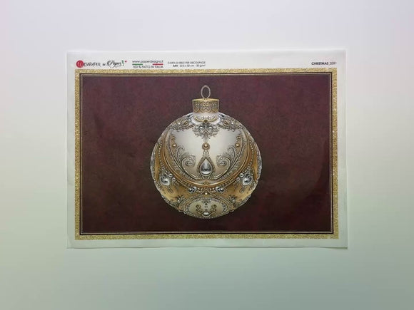 Bring luxurious holiday style to your crafts with Paper Designs Italy’s Regal Gold & Silver Bauble decoupage paper. This A4 sheet features a beautifully ornate ornament in shimmering silver and gold, richly detailed with scrollwork and jewel-like accents, framed against a deep burgundy background with a touch of golden sparkle. Perfect for cards, ornaments, gift tags, holiday décor accents, and small craft projects, this elegant design adds timeless sophistication to your seasonal creations.